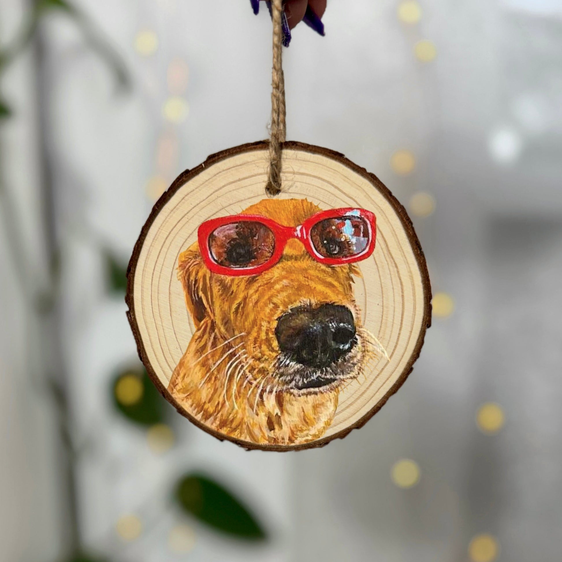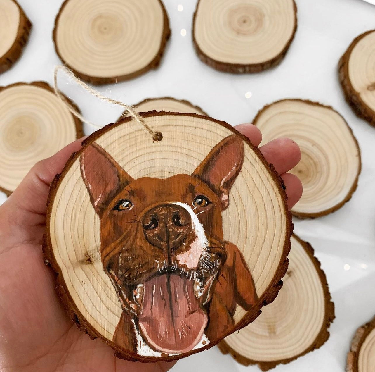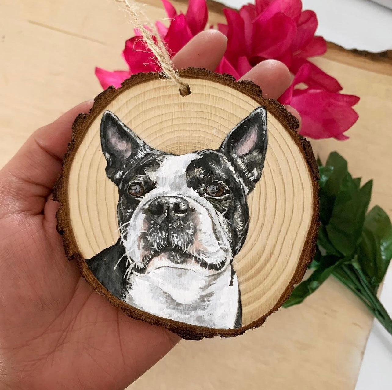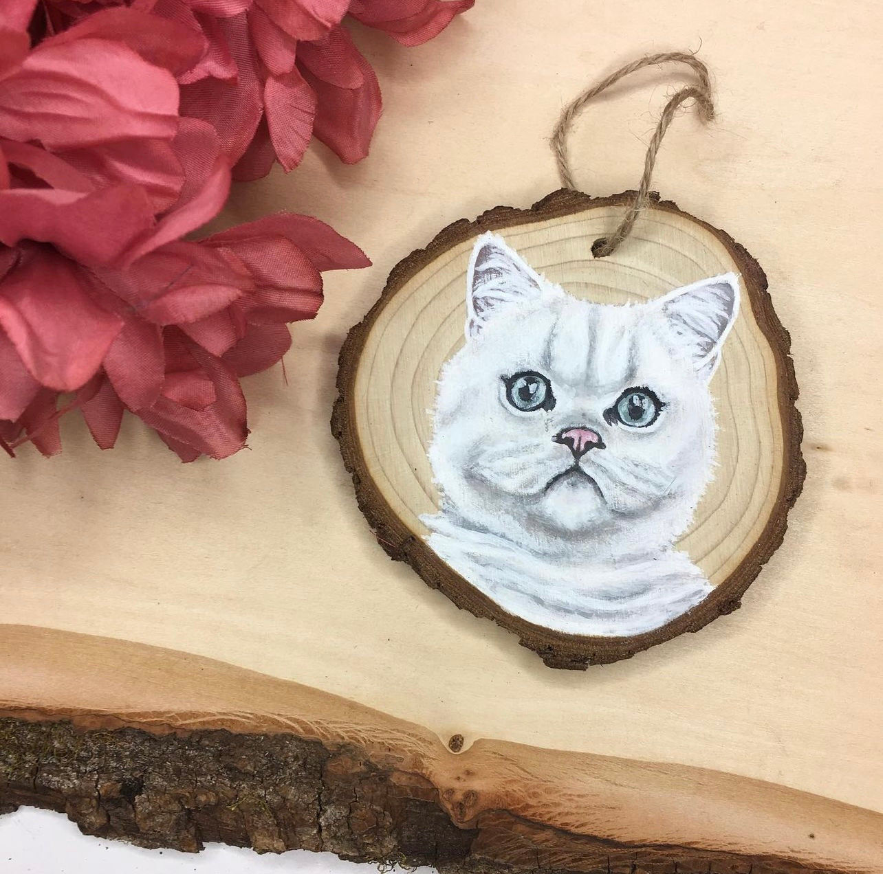 Each ornament is carefully hand painted using high-quality acrylic paints then sealed using a satin finish varnish on a 4-inch wood round, featuring a rustic twine string for easy hanging. Perfect for adding a personal touch to your Christmas tree or displaying as a year-round keepsake of your pet!